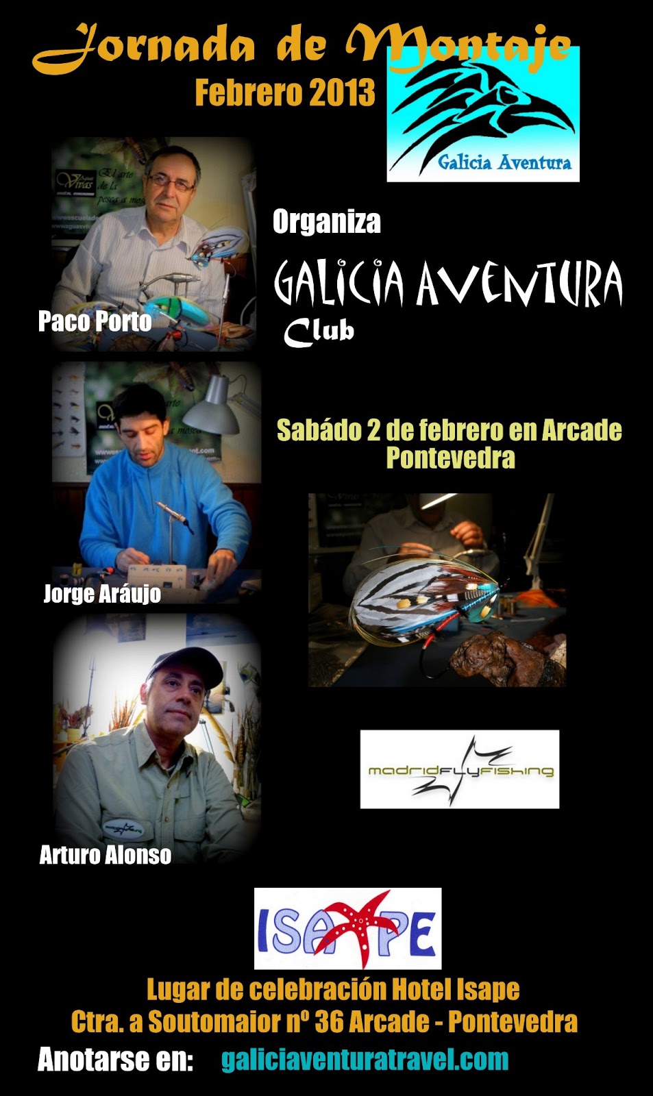 El club de pesca Galicia Aventura organiza esta jornada de montajes en el Hotel Isape en Arcade, Pontevedra. Contamos con tres ilustres montadores, Paco Porto que nos deleitará con montajes de moscas para salmón, Jorge Araujo-Ginho de Portugal nos montará sus ninfas para la competición y Arturo Alonso rematará la jornada con sus últimas creaciones.